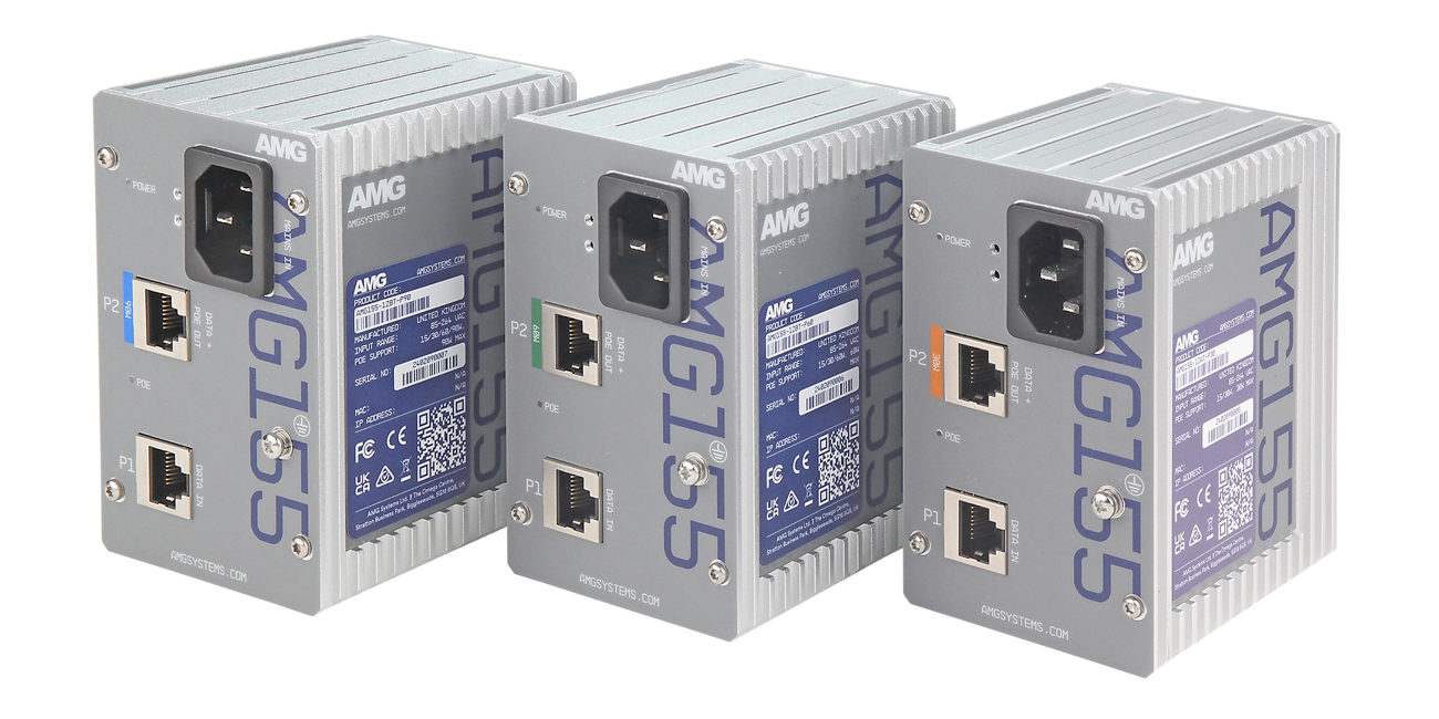 Tom Exley, AMG Technical Director adds “The AMG150/155 series sets the quality standard. Our engineering team looked at what was currently available, identified weaknesses, and engineered our product line to overcome those weaknesses. Many competitors offer Asia-sourced PoE injectors. None are equal in terms of being industrially hardened and made in an ISO9001-certified facility and still being cost-effective. We believe in the quality and stand behind them with lifetime support. This injector opens dozens of applications that can now utilize PoE as the power source. Plus having a product made in the UK gives your network an added layer of security.”