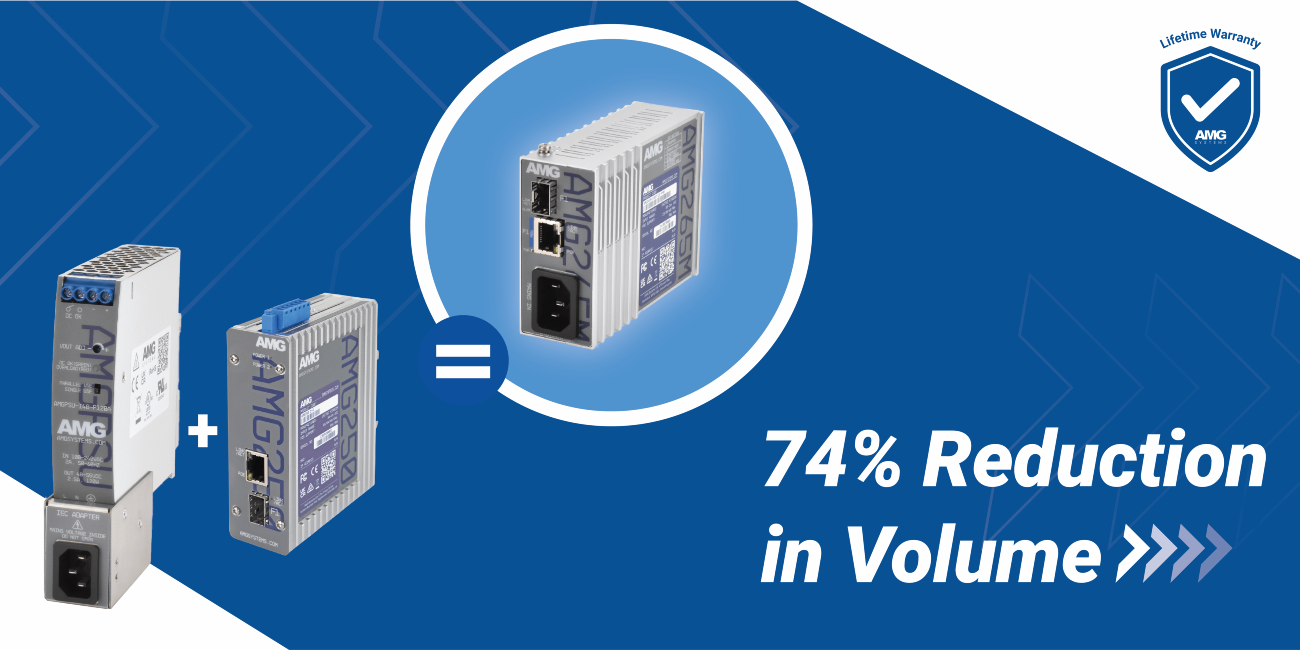 Tom Exley, AMG Technical Director adds “The AMG265M continues our quality standard. Our engineering team looked at what was currently available, identified weaknesses, and engineered the AMG265M to overcome those weaknesses. Offering a media converter that requires no external power supply and can be easily connected to any available AC power supply is a simple solution for our customers and one less thing to potentially fail. The AMG265M has no equal in terms of this unique ultra-compact size, industrially hardened, with full 90W PoE capability, made in an ISO9001-certified facility, and most importantly, available when you need them. We believe in the quality and stand behind them with lifetime support. This media converter solves the density challenge, allowing the user to utilize more devices in a smaller area. Plus having a product made in the UK gives your network an added layer of security.”