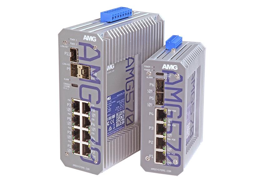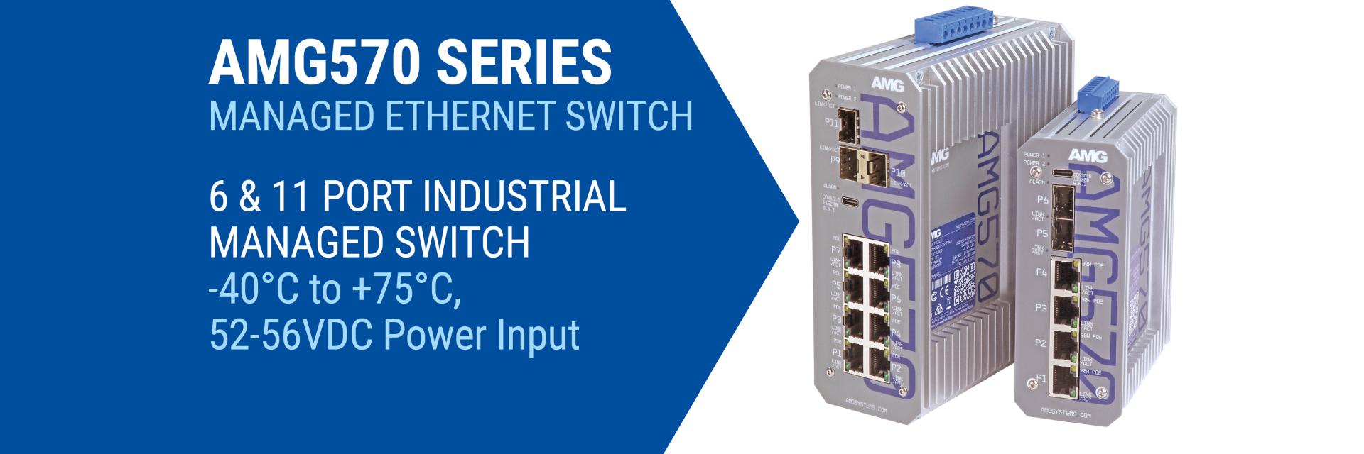 The AMG570 Series of 6 and 11-port industrially hardened Layer 2+ Ethernet switches with PoE for applications requiring up to 90 Watts of operating power offers, Layer 2 network management with additional Layer 3 capabilities, such as DHCP and static routing.