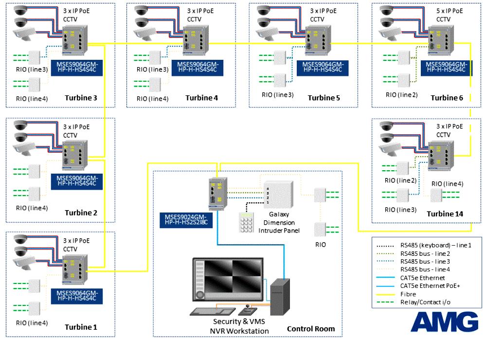 Connect all 14 turbines over a single converged IP fibre network Transmit over 60 HD IP PoE CCTV cameras back to the centralised CCTV Network Video Recorders & workstations Transmit multiple Honeywell Galaxy RS485 data bus lines to/from the 20 RIOs (remote I/O) and keypads at the 14 wind turbines back to the Galaxy main panel in the control room Provide PoE+ (up 30W) for all connected cameras from the Ethernet switch equipment Compact single box solution to transmit video, Galaxy RS485 and PoE+ power to all cameras Ensure network equipment could withstand wide ranging temperatures: -40°C to 75°C. Provide a unified management interface for maintenance and diagnostics of the network and RS485 i/o DIN rail mountable.