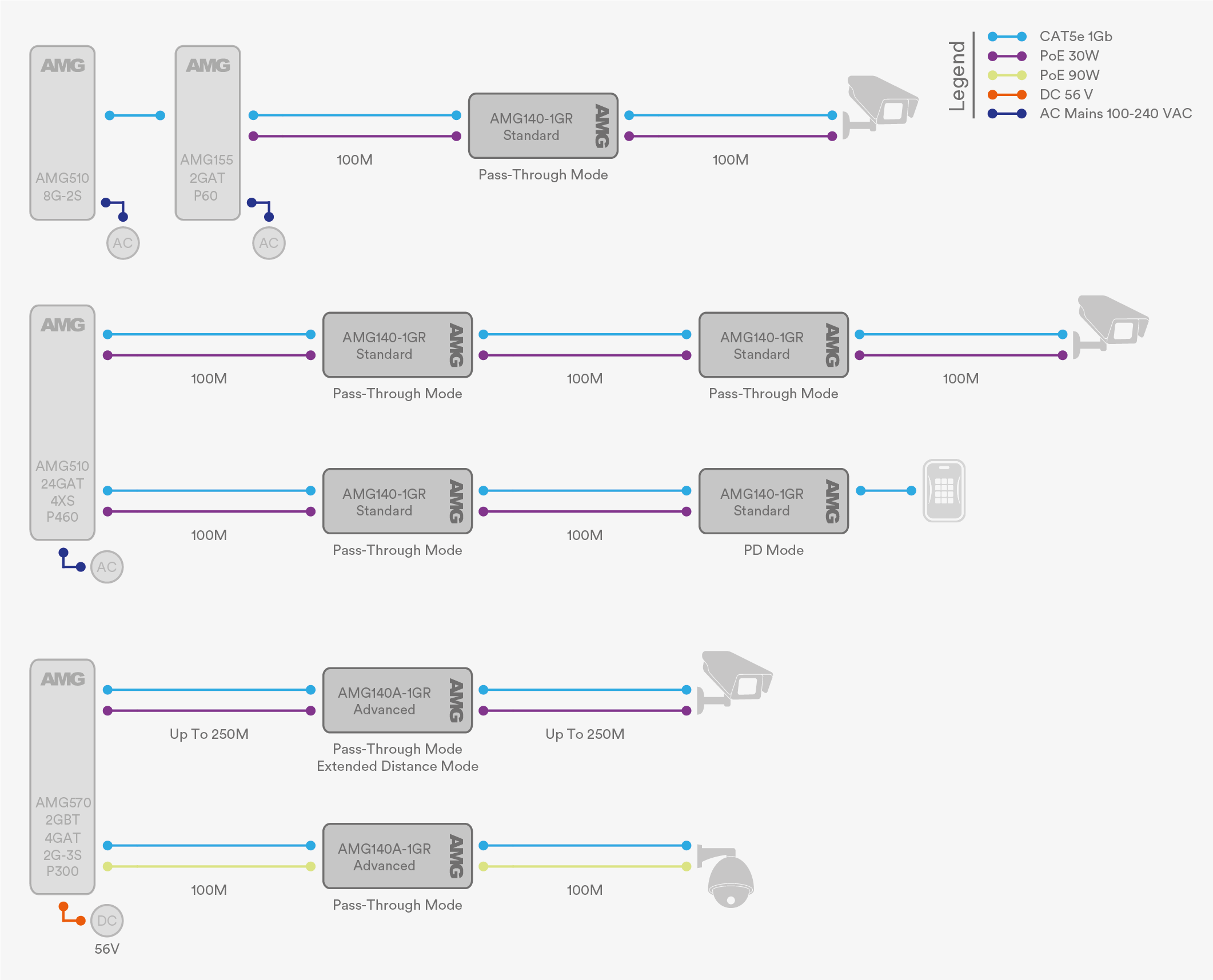 The AMG140 series support IEEE802.3at 30W and IEEE802.3bt 60/90W PoE pass-through and are suitable for powering the latest high powered PoE devices over a wide industrial operating temperature range at extended distances. The units can also be configured to operate as a PD device where the edge network equipment does not require PoE.