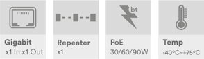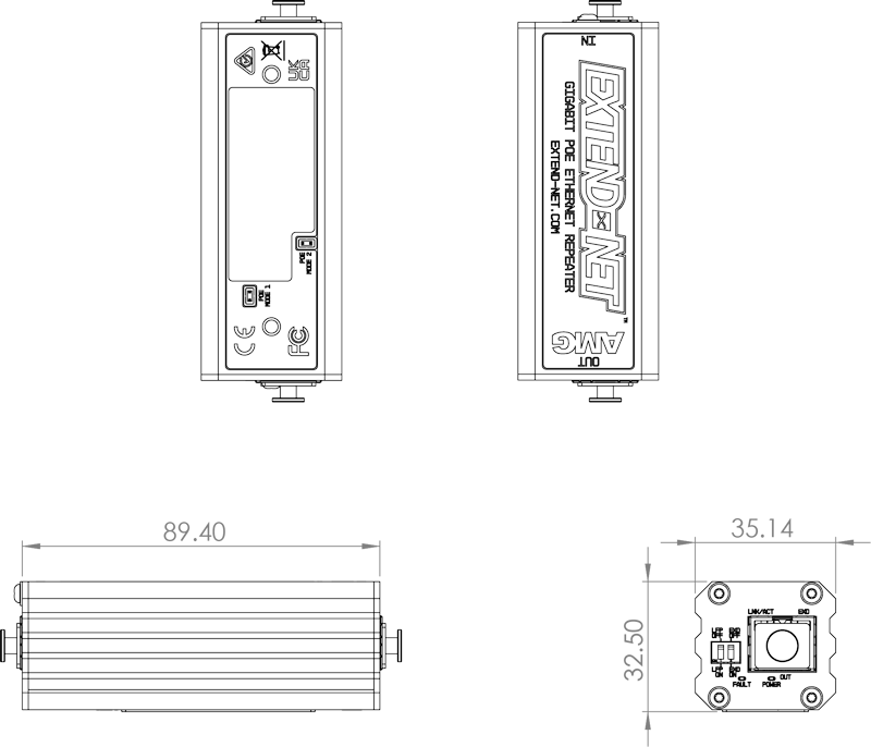 AMG’s Extend-Net™ industrial Ethernet repeaters provide 10/100/1000Mb Ethernet extension over UTP cable with support for pass-through 30W or 60/90W PoE. These single channel models feature dual RJ45 ports and provide an additional 100 meter range over standard Cat5/6 cable.