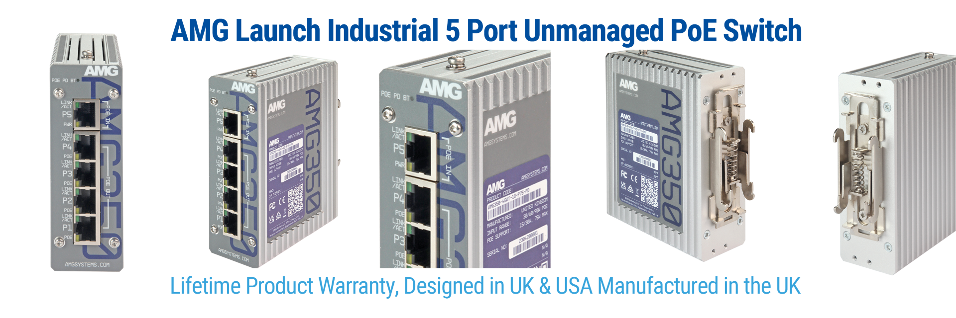 Tom Exley, AMG Technical Director adds “The AMG350 unmanaged switch sets the quality standard. Our engineering team looked at what was currently available, identified weaknesses, and engineered our product line to overcome those weaknesses. There are dozens of versions of this switch. None are equal in terms of being industrially hardened and made in an ISO9001 certified facility. We believe in the quality and stand behind them with lifetime support. This switch opens dozens of applications that can now utilize PoE as the power source. Plus having a switch made in the UK gives your network an added layer of security.”