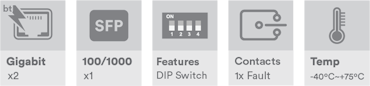 2+1 Industrial PoE Media Converter 2 x 10/100/1000Base-T(x) RJ45 Ports with 802.3bt 60/90W PoE, 1 x 100/1000Base-Fx SFP Port, DIP-Switch Functions, DIN Rail / Wall Mount, -40°C to +75°C, 2 x 52-56VDC Power Inputs, Fault Relay
